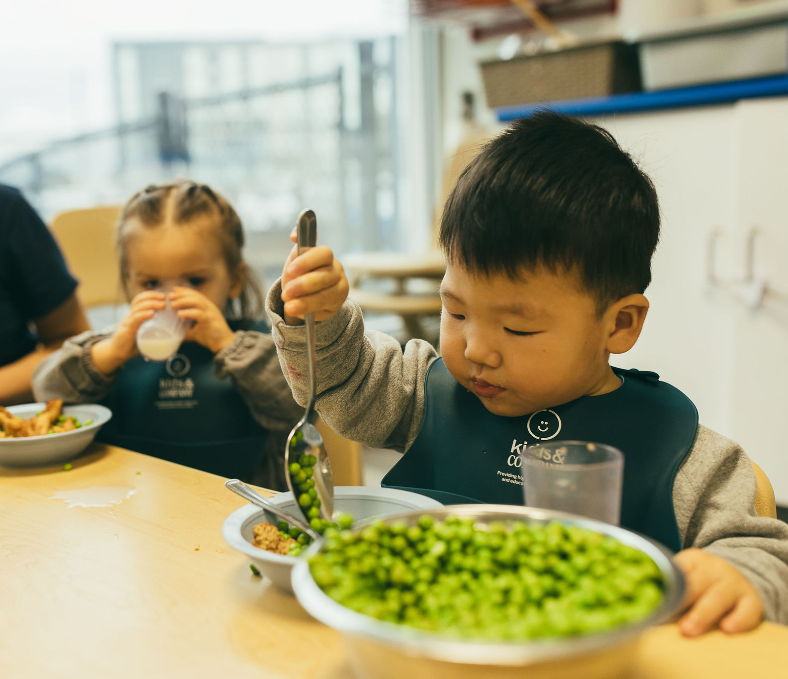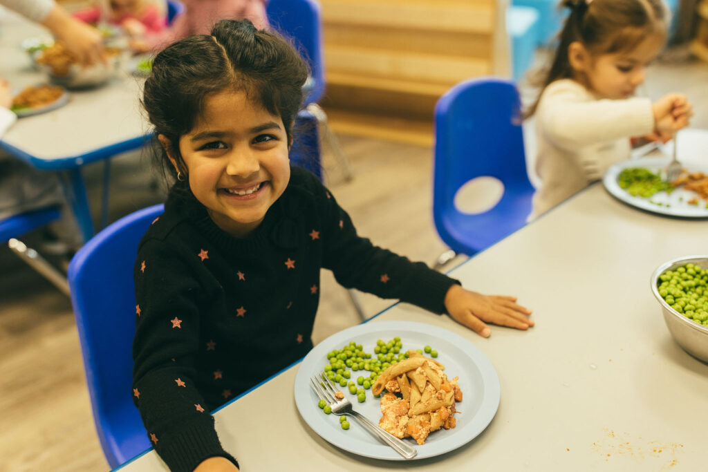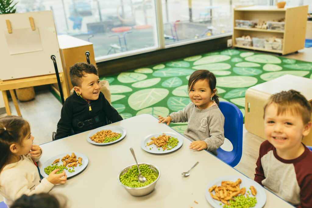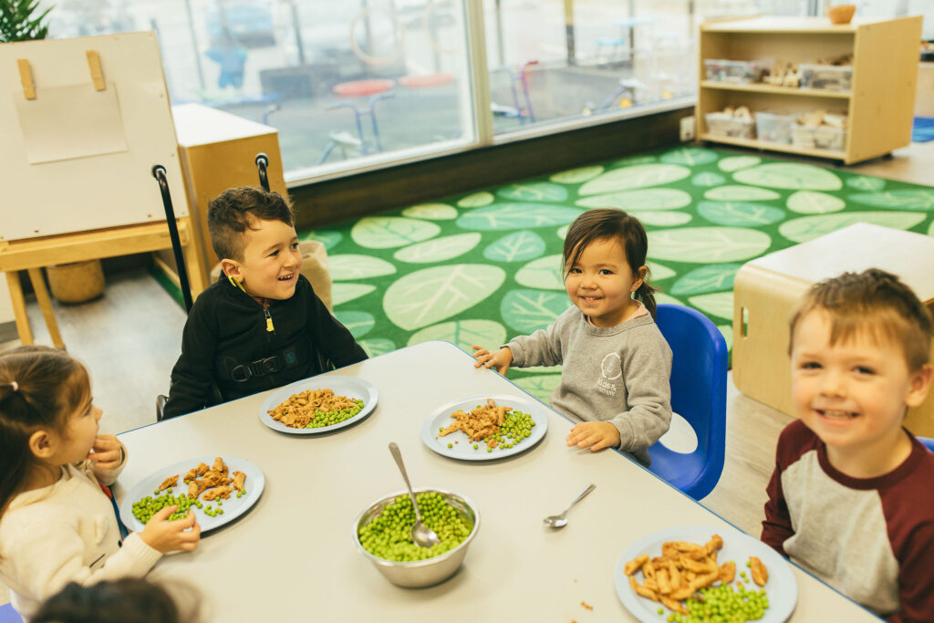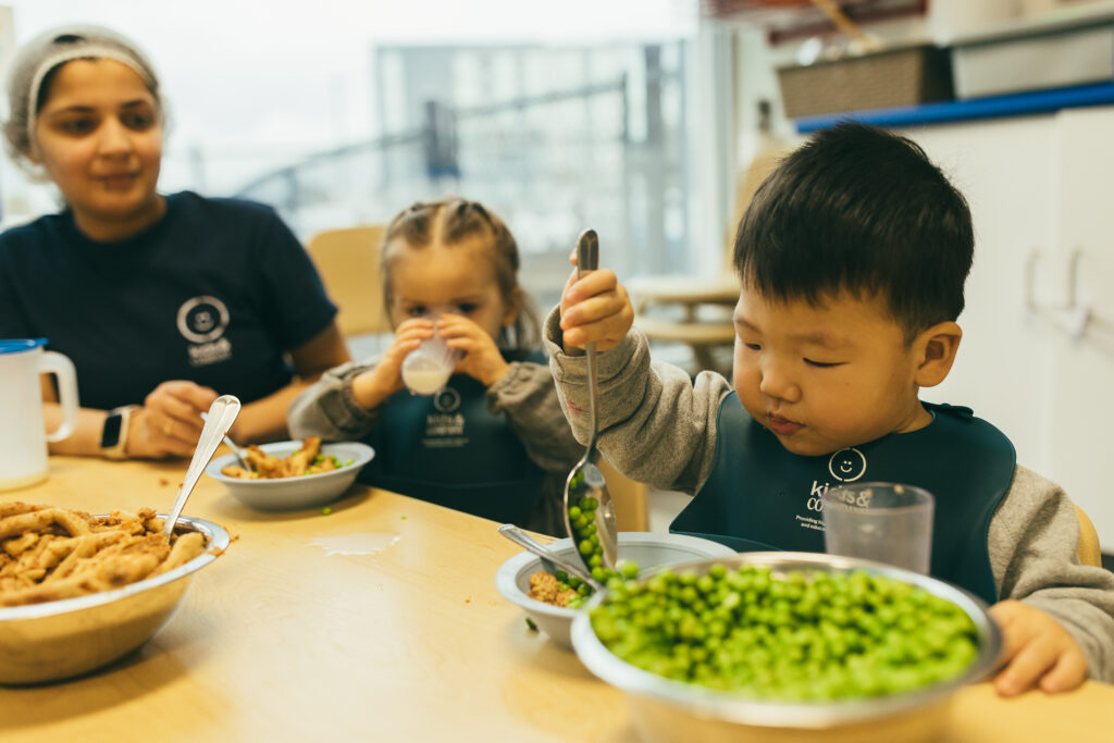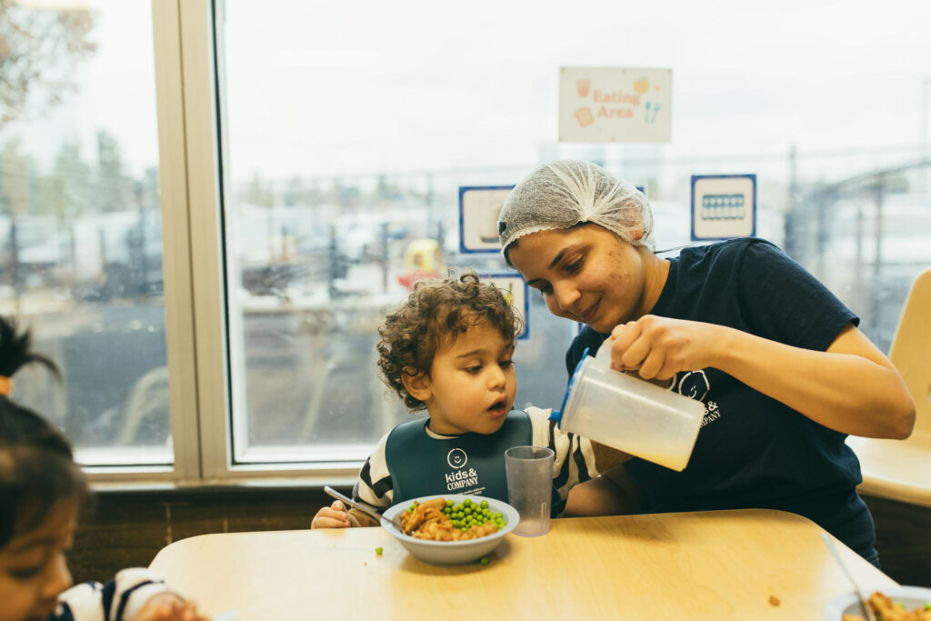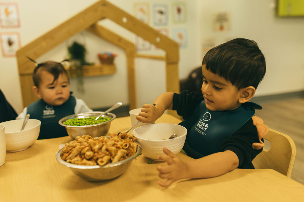 At Kids & Company, we enjoy meals family-style. Main dishes and sides are placed in serving bowls on the table so children can serve themselves. This encourages them to develop independence, confidence, and social skills, while learning to make their own food choices and take pride in what they eat.