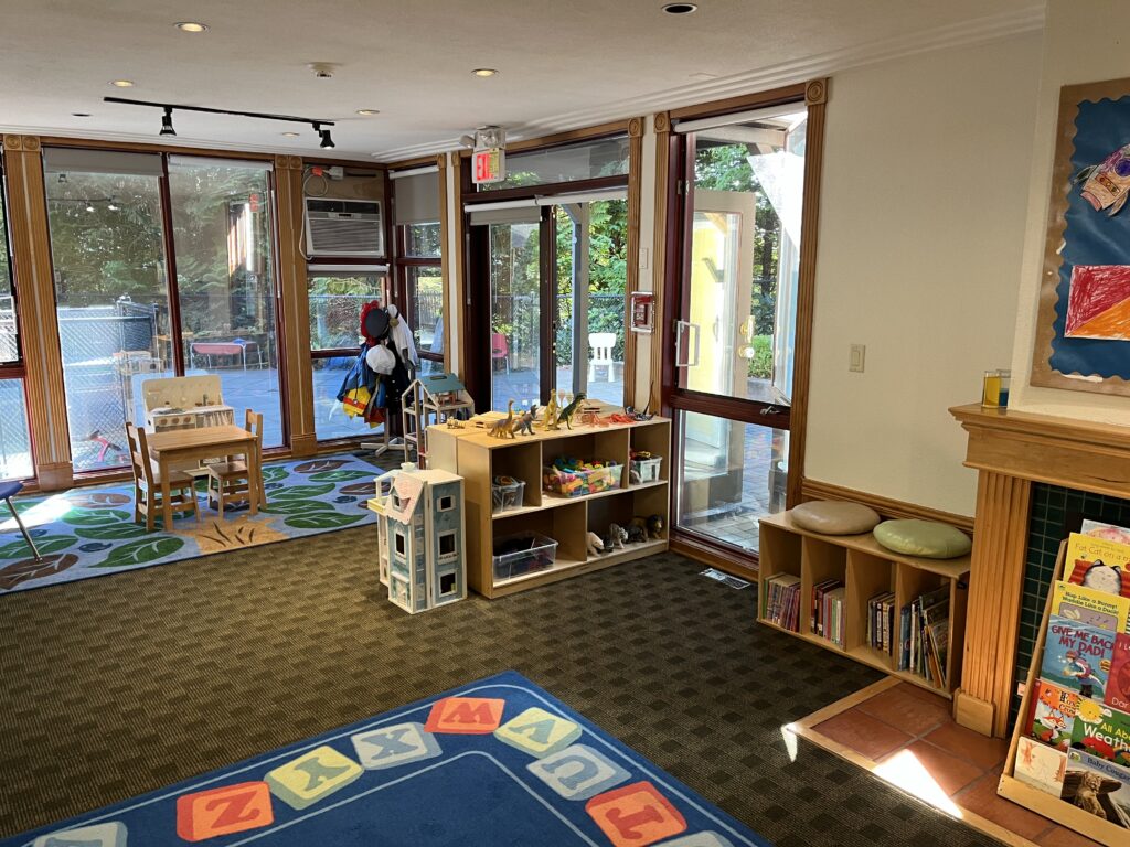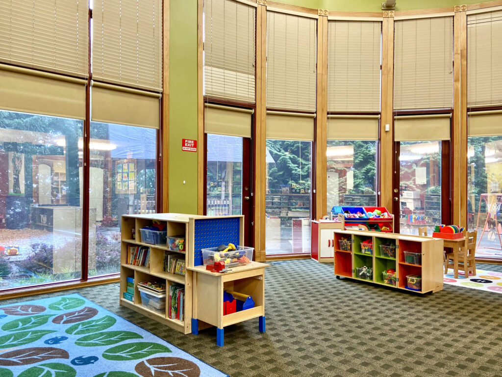 Families appreciate the serene, private setting surrounded by trees and a quiet neighbourhood. Classrooms feature large bright windows, and the outdoor play area includes wood-chips, separate spaces for different age groups, and plenty of toys.