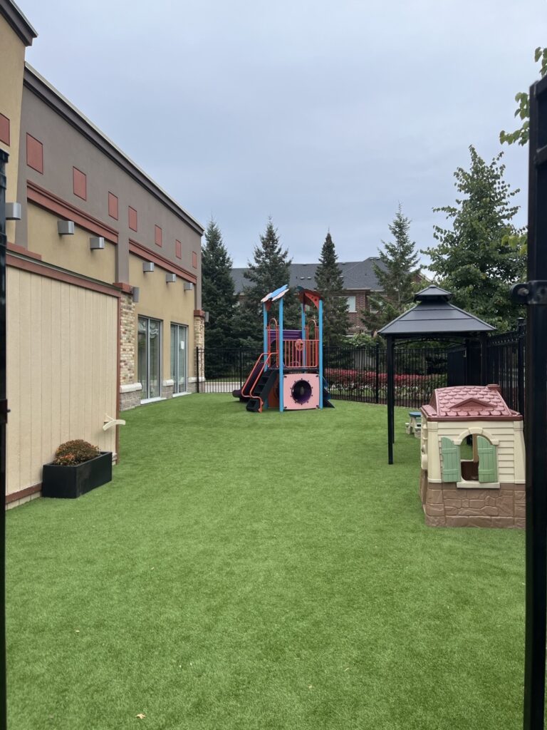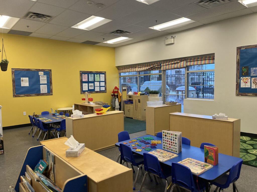 Families enjoy the bright classrooms with large windows and the spacious outdoor area that includes an infant playground and separate toddler and preschool spaces, each with age-appropriate structures and toys.