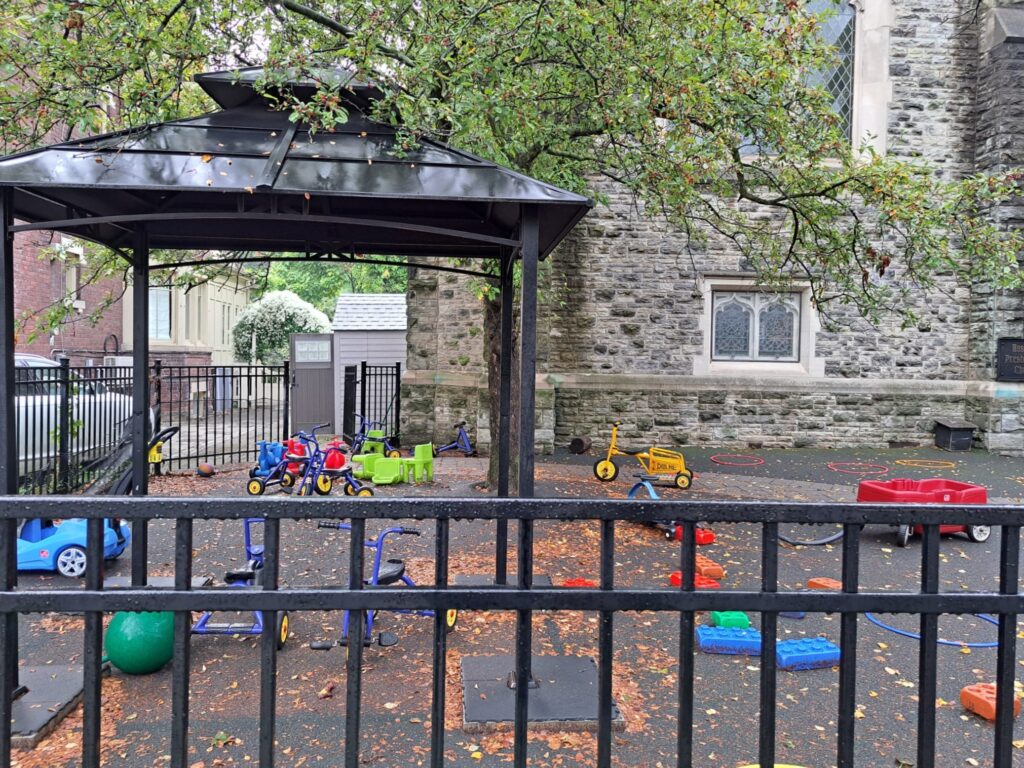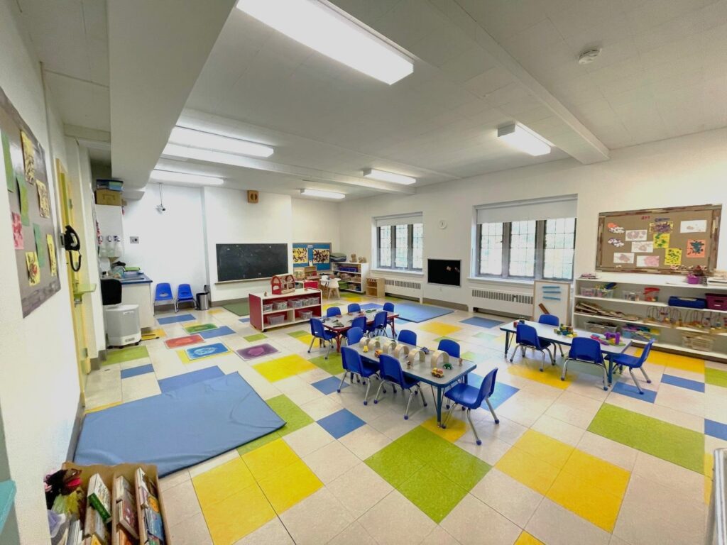 Families enjoy the beautifully treed outdoor area, which includes private playgrounds in both the front and back of the building for safe and engaging outdoor play.