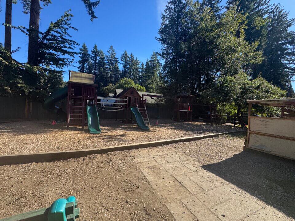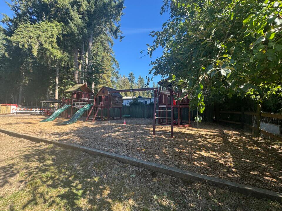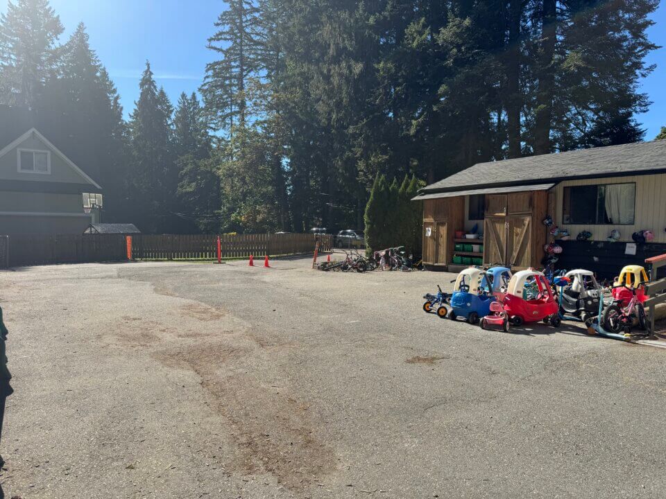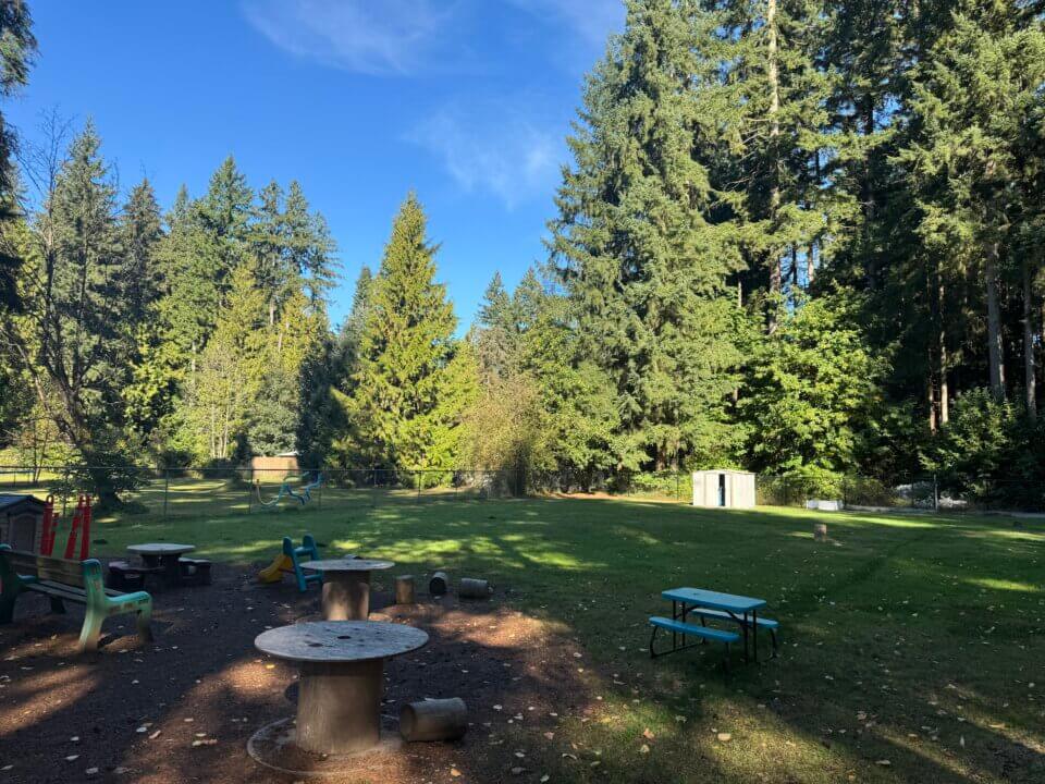 We have a safe on-site playground, a blacktop area for riding bikes, a large field, and a beautiful forested area. Located on spacious residential acreage, we are an outdoor-focused centre, and our children spend most of their days exploring and playing outside.