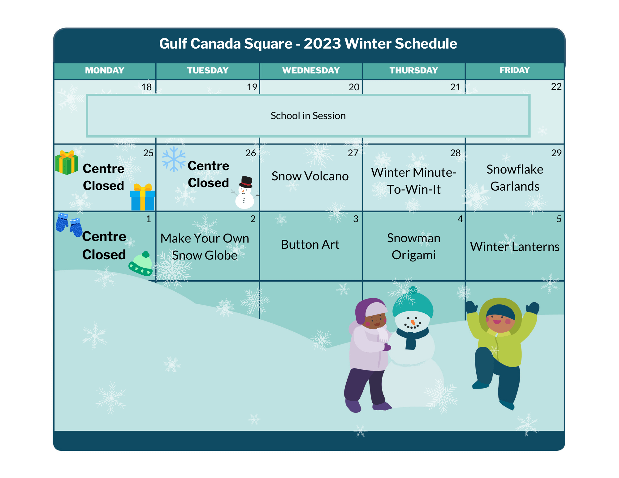 Apr 2 & 29 | Winter Break: Dec 22-24, 29-31, and Jan 2 March Break: Mar 16-20 |