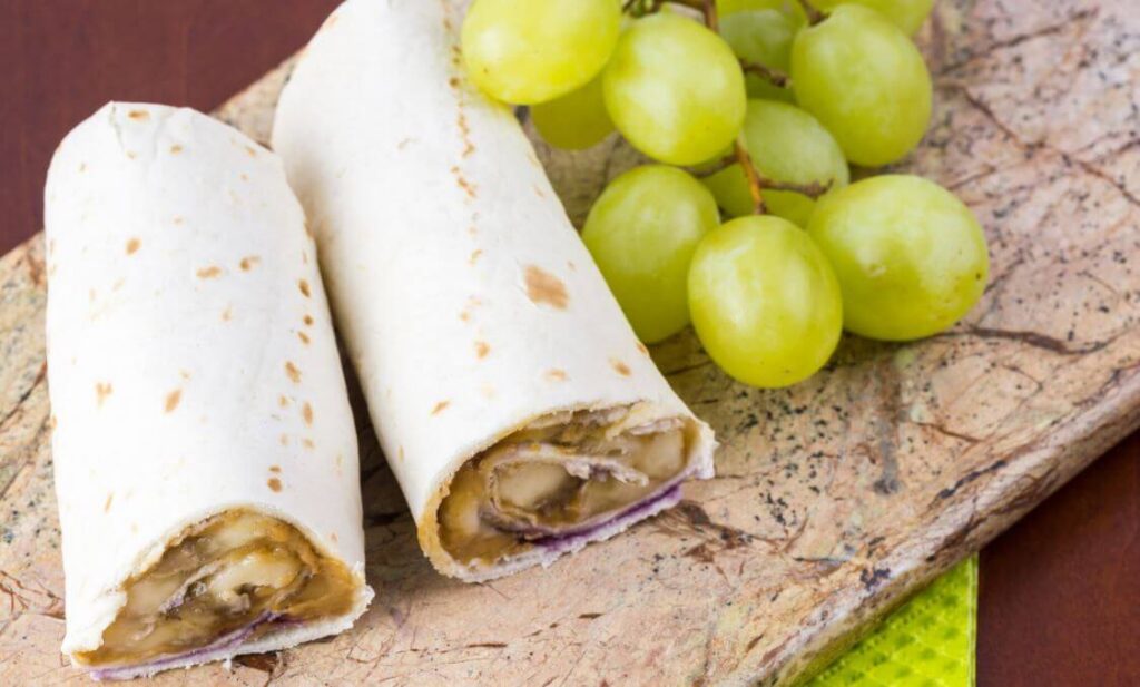 - Place whole peeled banana on tortilla and roll-up.