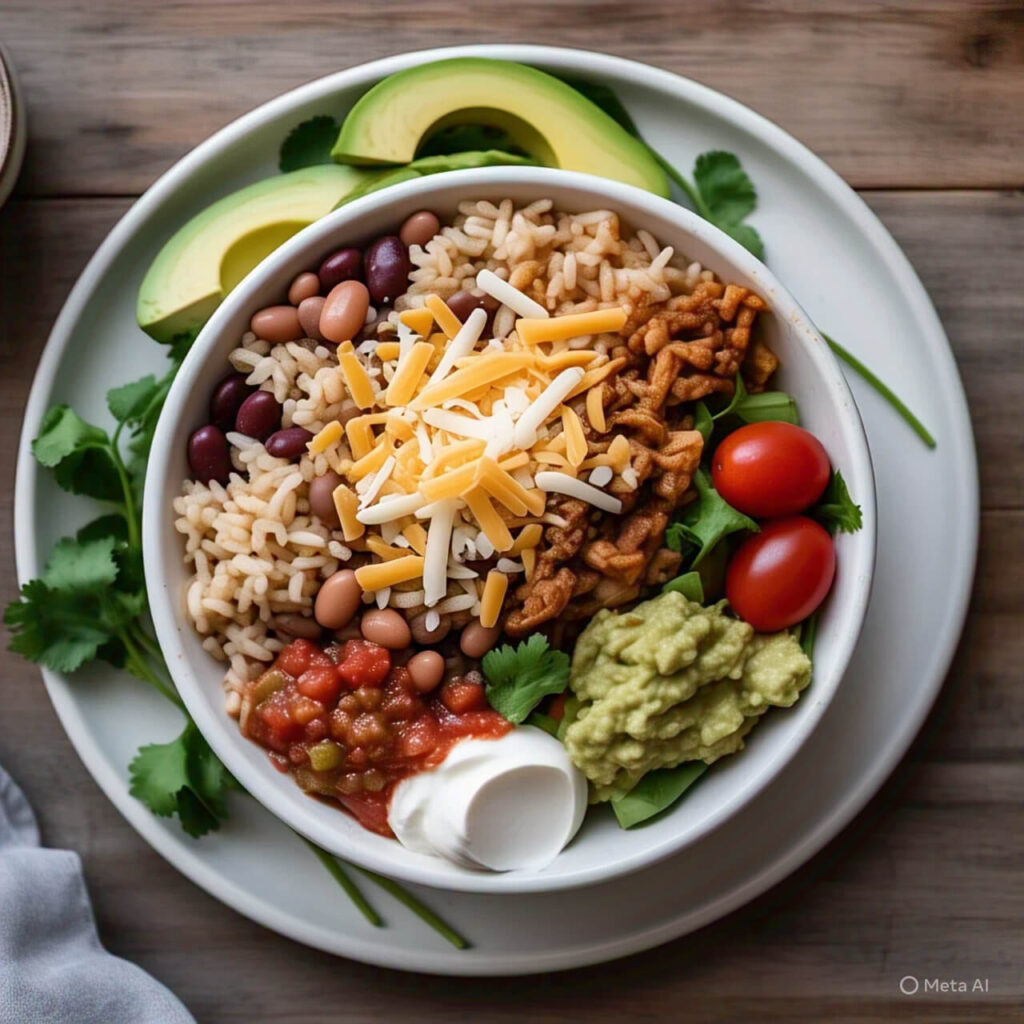 - Serve in a bowl with ½ of brown rice, ¼ cup of beans, and top with 1 Tbsp of shredded cheese.