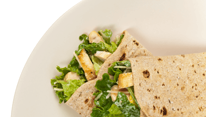 - Toss lettuce in dressing. Portion ½ cup salad per tortilla and top with cooked diced chicken.