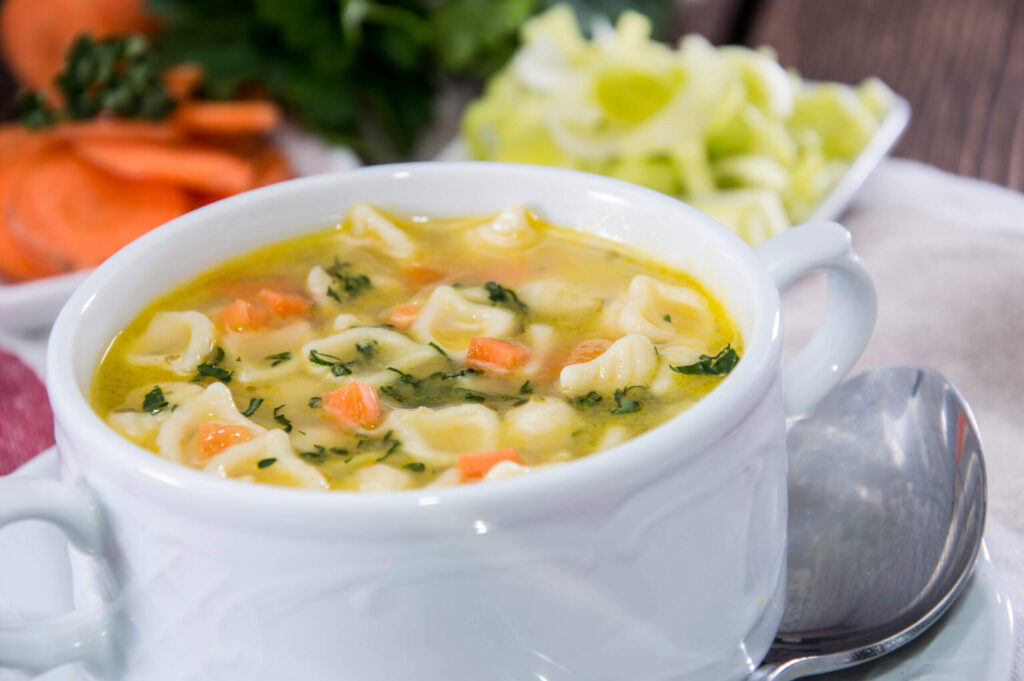 - In a large stockpot over medium heat, add olive oil, onions, carrots, and celery, and sauté, stirring occasionally, until tender, about 3-4 minutes. Stir in garlic until fragrant, about 1 minute.