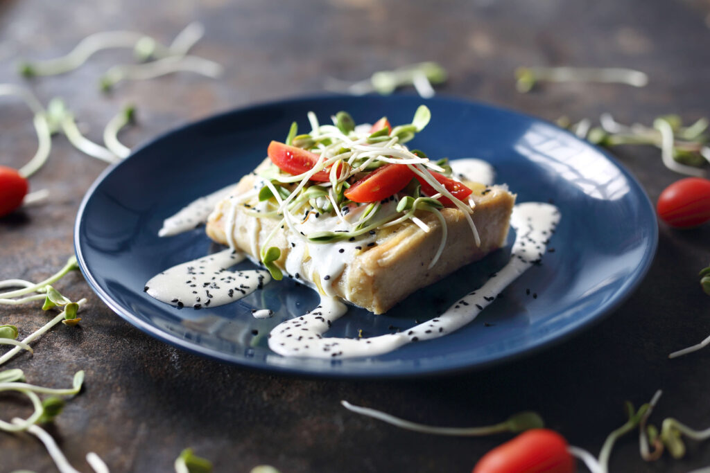 - For the marinade, mix together yogurt, garlic and dill in a bowl whisking together. Add tofu fillet pieces, refrigerate and marinade overnight.