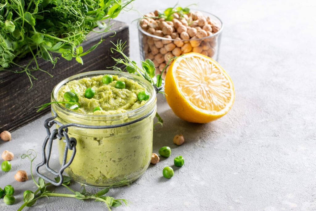 - Puree peas, garlic, lemon juice and cream until smooth.