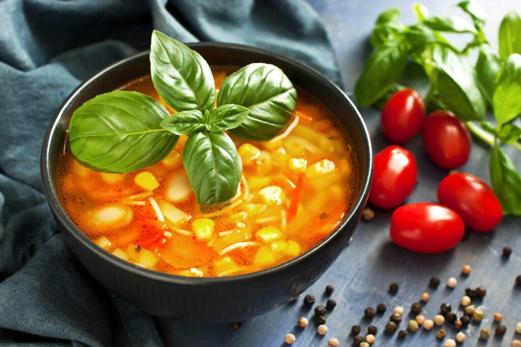 - Add the stock and let the soup simmer for 20 minutes. Add the corn and peas in the last 5 minutes