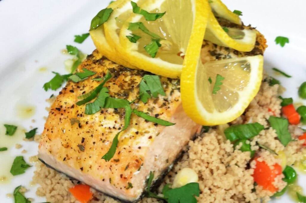 Salmon is a very mild fish and will take on the flavour of your marinade or seasoning. Dill is a very common herb to use with salmon, and the lemon will add an element of brightness to your dish!