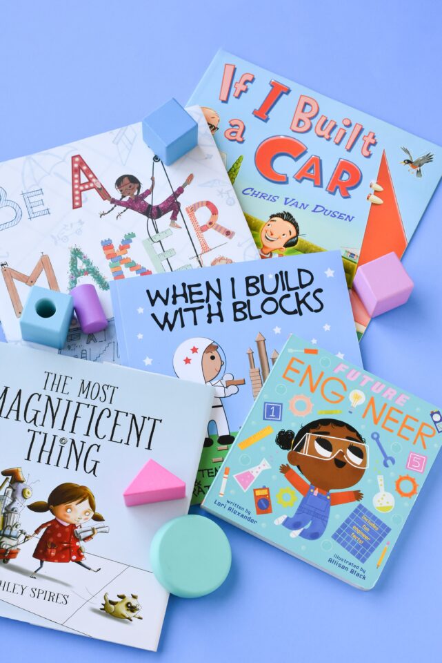 This book transports an everyday classroom into various imaginative scenes – from outer space to the ocean – using blocks! Blocks are an amazing open-ended STEM tool that allow children to use their imagination, while they learn about math and spatial relations.